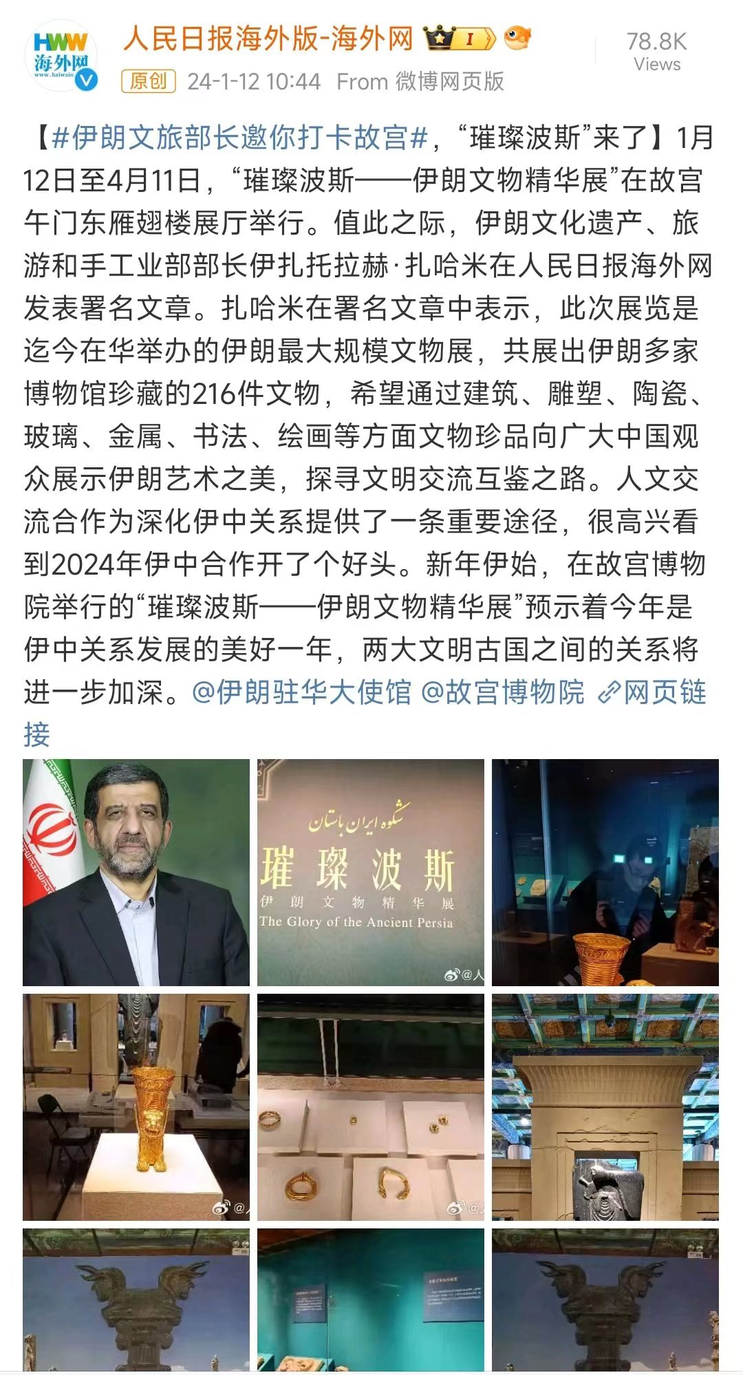 Iranian Minister of Culture and Tourism invites you to check in the Palace Museum Bright Persia is coming