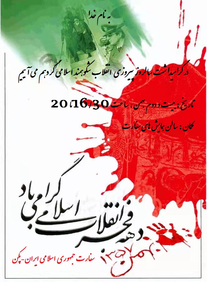 مراسم جشن پیروزی سالروز انقلاب اسلامی روز جمعه مورخ 22 بهمن ماه سال جاری در سالن همایش ج.ا.ایران در پکن برگزار خواهد شد. از عموم هموطنان مقیم دعوت می‌گردد در مراسم فوق شرکت نمایند.