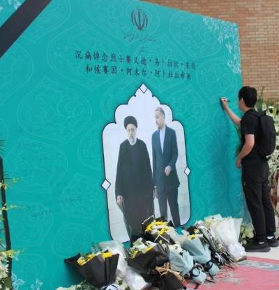 2024年5月24日,部分中国民众自发来到伊朗驻华大使馆,悼念遇难的伊朗总统和外交部长,人们献上鲜花,写下吊唁寄语,送别中国人民的老朋友。 我们再次感谢中国政府及人民的哀悼与同情。连日来,中国各地的朋友们,通过社交媒体、电子邮件、电话等各种方式表达了对莱希总统、阿卜杜拉希扬外长及其随行人员遇难的哀悼。伊朗驻华大使馆感激中国朋友在这一艰难时刻向我们表达友谊。