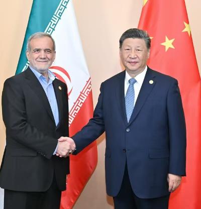 习近平指出,伊朗是具有重要地区和国际影响的国家,也是中国的好朋友、好伙伴。在世界百年变局加速演进背景下,中伊关系的战略意义更加突显。无论国际和地区形势如何变化,中方都将毫不动摇发展同伊朗友好合作。中方支持伊朗维护好国家主权、安全和民族尊严,稳步推进自身经济社会发展,改善并深化同周边国家的睦邻友好关系。中方愿同伊方坚定相互支持,维护不干涉内政等国际关系基本准则,维护两国的正当权益。中方愿同伊方加强各领域交流合作,推动两国全面战略伙伴关系健康稳定发展,更好造福两国人民。 习近平祝贺并欢迎伊朗首次作为正式成员参加金砖国家领导人会晤,指出中方愿同伊方在金砖等多边框架内加强合作,进一步提升全球南方的影响力和发言权,推动国际秩序朝着更加公正合理的方向发展。 佩泽希齐扬表示,中国是伊朗最重要的合作伙伴,伊中全面战略伙伴关系及各领域合作保持良好发展势头。伊方希同中方共同努力,落实好两国全面合作计划,推动两国在互联互通、基础设施、清洁能源等领域深化合作,取得更多成果,这不仅将助力伊朗国家发展,也有助于促进地区和平与稳定。伊方愿同中方继续在涉及彼此核心利益问题上坚定相互支持,共同反对霸权霸凌。感谢中方支持伊朗正式加入金砖合作机制,期待同中方在金砖国家等多边平台密切协作。 双方还就当前中东地区形势交换意见。习近平指出,中方对当前中东地区局势深感忧虑。尽早实现加沙停火止战,是缓和地区局势紧张的关键。国际社会应该形成合力,敦促有关各方切实履行联合国安理会决议,避免地区局势进一步动荡。 蔡奇、王毅等参加会见。
