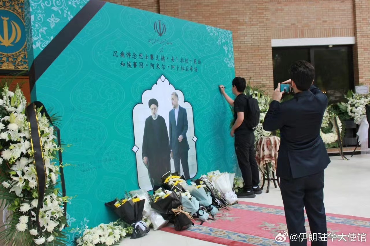 2024年5月24日,部分中国民众自发来到伊朗驻华大使馆,悼念遇难的伊朗总统和外交部长,人们献上鲜花,写下吊唁寄语,送别中国人民的老朋友。